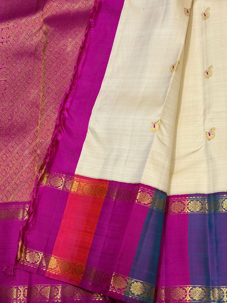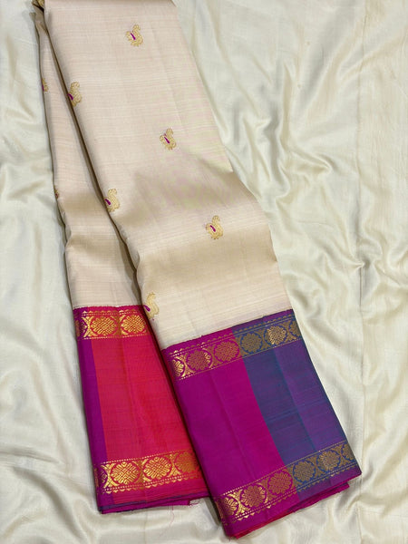 Classic OffWhite & Deep Violet 2gm Zari Elegance Kanchipuram Handloom Silk Saree SS26919