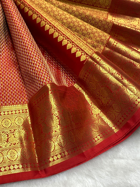 Classic Dark Orange Red 2gm Zari Bridal Elegance Kanchipuram Handloom Silk Saree SS26494