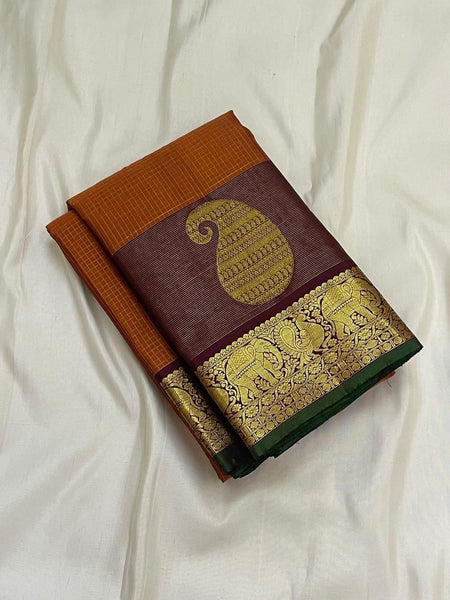 Classic Burnt Orange & Coffee Brown 1gm Zari Vintage Checks Elegance Kanchipuram Handloom Silk Saree SS26984