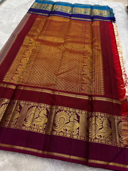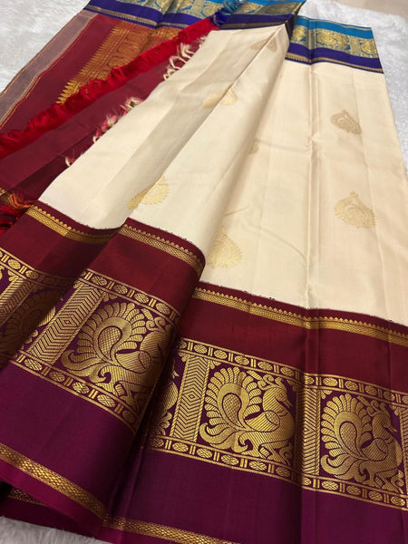 Classic Pearl Cream & Barn Red Blue Elegance Kanchipuram Handloom Silk Saree SS26955