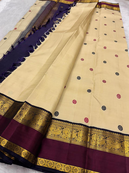 Classic Pearl Cream & Berry Wine Blue Elegance Kanchipuram Handloom Silk Saree SS26956